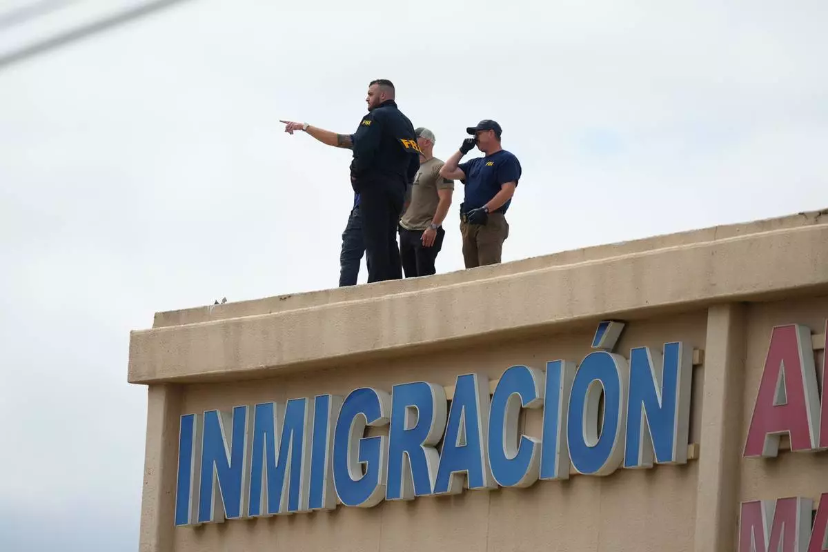 Law enforcement agents investigate the roof of an apartment building near the scene of a shooting at a U.S. Immigration and Customs Enforcement office in Dallas on Wednesday, Sept. 24, 2025. (AP Photo/Julio Cortez)
