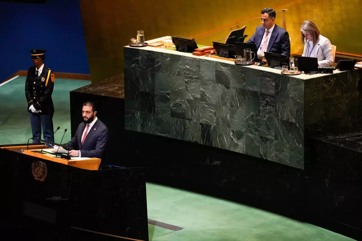 Syria interim President Ahmad Al-Sharaa addresses the 80th session of the United Nations General Assembly, Wednesday, Sept. 24, 2025. (AP Photo/Richard Drew)