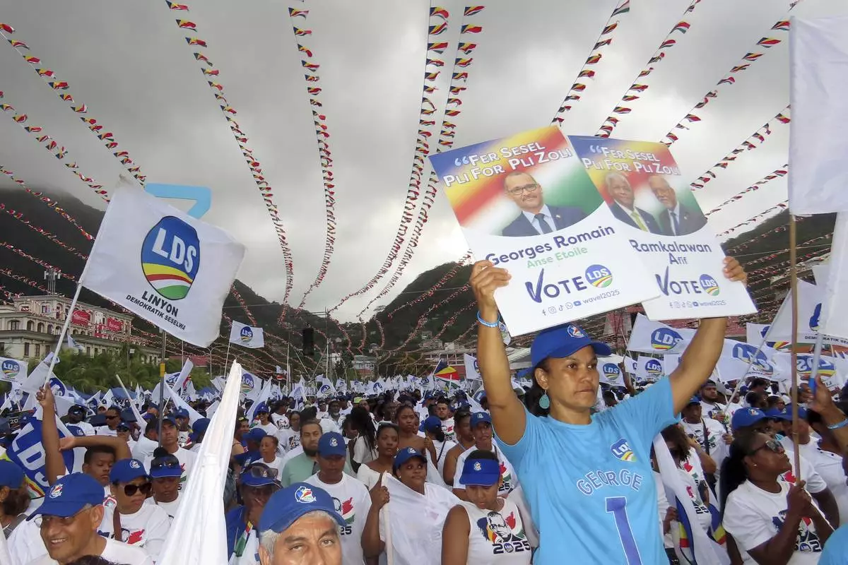 Supporters of Linyon Demokratik Seselwa's party attend a campaign rally at Freedom Square in Victoria, Seychelles, Sunday, Sep. 21, 2025. (AP Photo/Emilie Chetty)