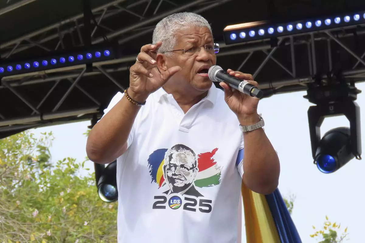 President Wavel Ramkalawan of the Republic of Seychelles and presidential candidate for Linyon Demokratik Seselwa delivers a speech at a campaign rally at Freedom Square in Victoria, Seychelles, Sunday, Sep. 21, 2025. (AP Photo/Emilie Chetty)