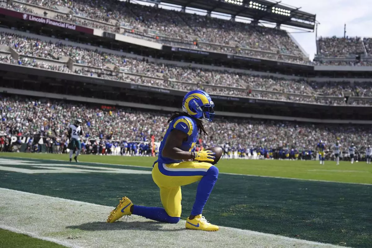 Los Angeles Rams wide receiver Davante Adams celebrates after scoring during the first half of an NFL football game against the Philadelphia Eagles Sunday, Sept. 21, 2025, in Philadelphia. (AP Photo/Matt Slocum)
