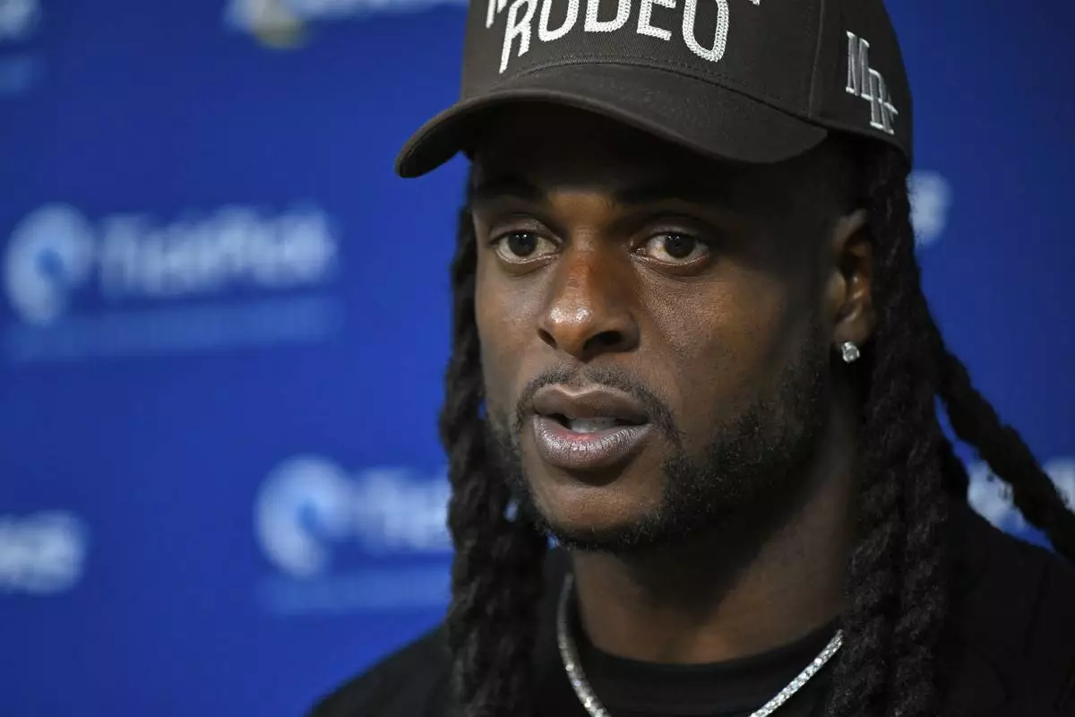 Los Angeles Rams wide receiver Davante Adams speaks during a news conference after the Rams defeated the Tennessee Titans in an NFL football game Sunday, Sept. 14, 2025, in Nashville, Tenn. (AP Photo/John Amis)