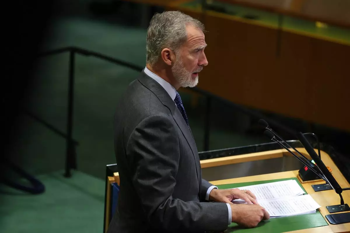 King Felipe VI of Spain addresses the 80th session of the United Nations General Assembly, Wednesday, Sept. 24, 2025, at U.N. headquarters. (AP Photo/Heather Khalifa)