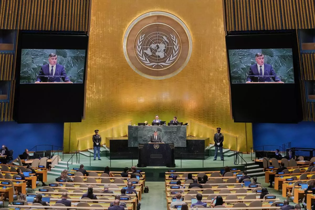 Croatia President Zoran Milanovic addresses the 80th session of the United Nations General Assembly, Wednesday, Sept. 24, 2025. (AP Photo/Richard Drew)