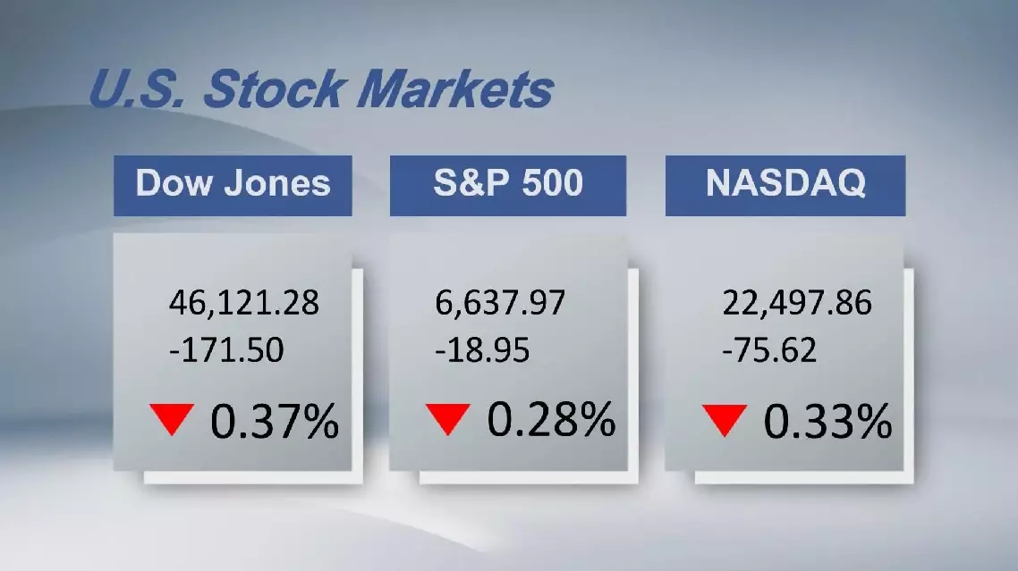 The Dow Jones Industrial Average fell by 171.50 points, or 0.37 percent, to 46,121.28. The Standard and Poor's 500 sank 18.95 points, or 0.28 percent, to 6,637.97. The Nasdaq Composite Index shed 75.62 points, or 0.33 percent, to 22,497.86.