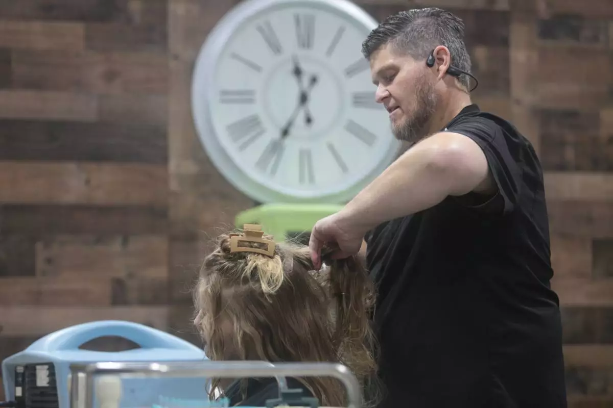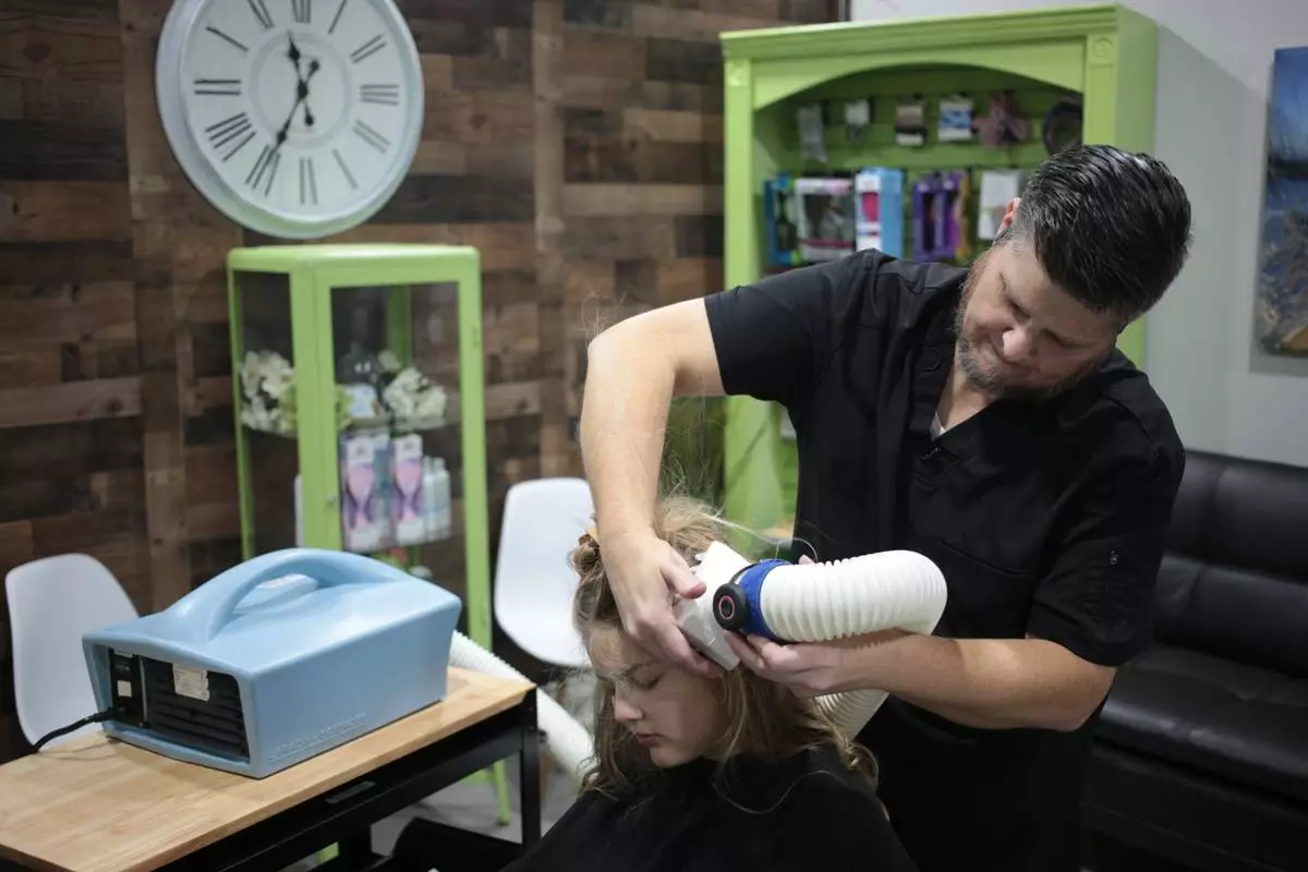 Jacob Anthon demonstrates the use of an FDA-cleared device that uses a combination of airflow temperature, speed, and direction to kill lice and eggs at Lice Clinics of America in Sugar Land, Texas, Monday, Sept. 22, 2025. (AP Photo/Lekan Oyekanmi)