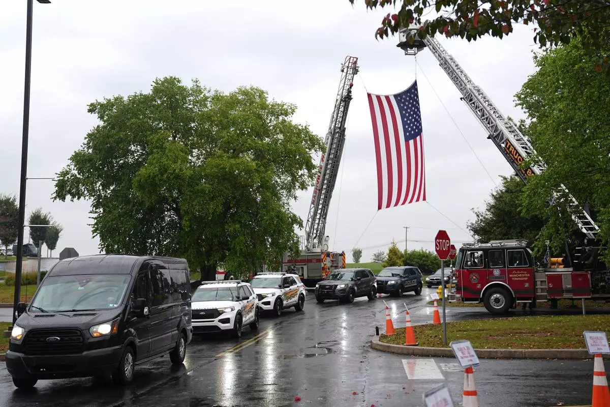People arrive ahead of funeral services and procession for slain Northern York County Regional Police detectives Cody Michael Becker, Mark Edward Baker and Isaiah Emenheiser, Thursday, Sept. 25, 2025, in Red Lion, Pa. (AP Photo/Matt Rourke)