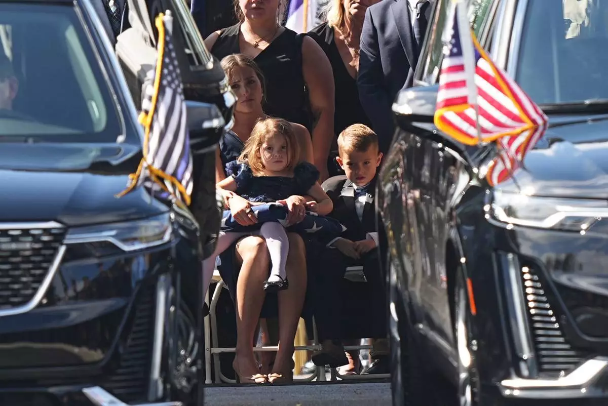 Loved ones look on at the conclusion of funeral services for Northern York County Regional Police detectives Cody Michael Becker, Mark Edward Baker and Isaiah Emenheiser, Thursday, Sept. 25, 2025, in Red Lion, Pa. (AP Photo/Matt Rourke)