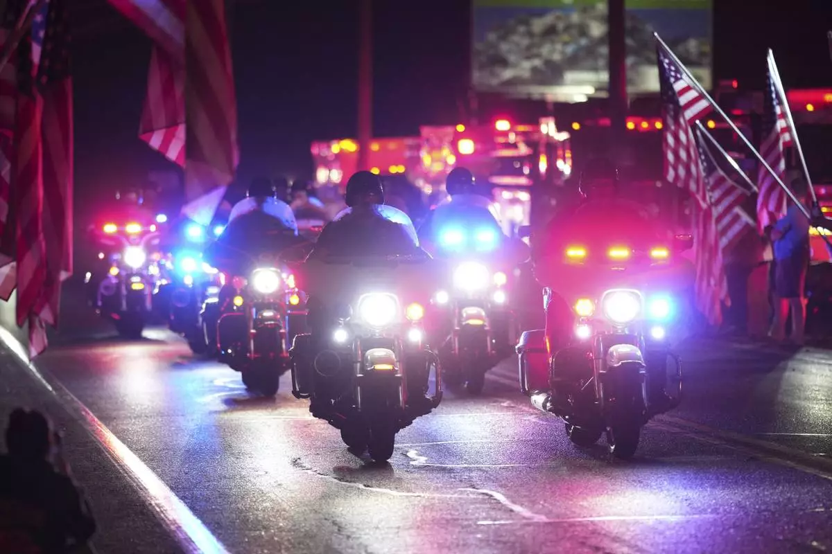 A procession passes for slain Northern York County Regional Police detectives Cody Michael Becker, Mark Edward Baker and Isaiah Emenheiser, Thursday, Sept. 25, 2025, in Red Lion, Pa. (AP Photo/Matt Rourke)