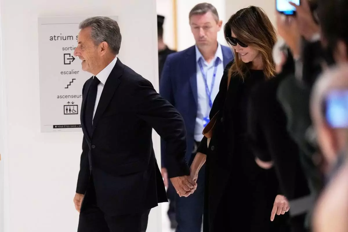 Former French President Nicolas Sarkozy and his wife Carla Bruni Sarkozy arrive to the courtroom for his verdict for alleged illegal financing of his 2007 presidential campaign by the government of then-Libyan leader Moammar Gadhafi, Thursday, Sept. 25, 2025 in Paris. (AP Photo/Michel Euler)