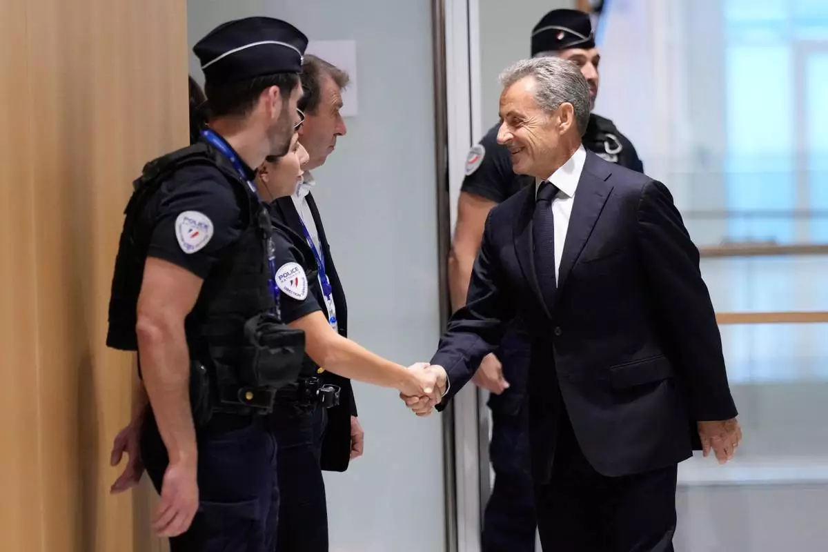 Former French President Nicolas Sarkozy shakes hands with a police officer before his verdict for alleged illegal financing of his 2007 presidential campaign by the government of then-Libyan leader Moammar Gadhafi, Thursday, Sept. 25, 2025 in Paris. (AP Photo/Michel Euler)