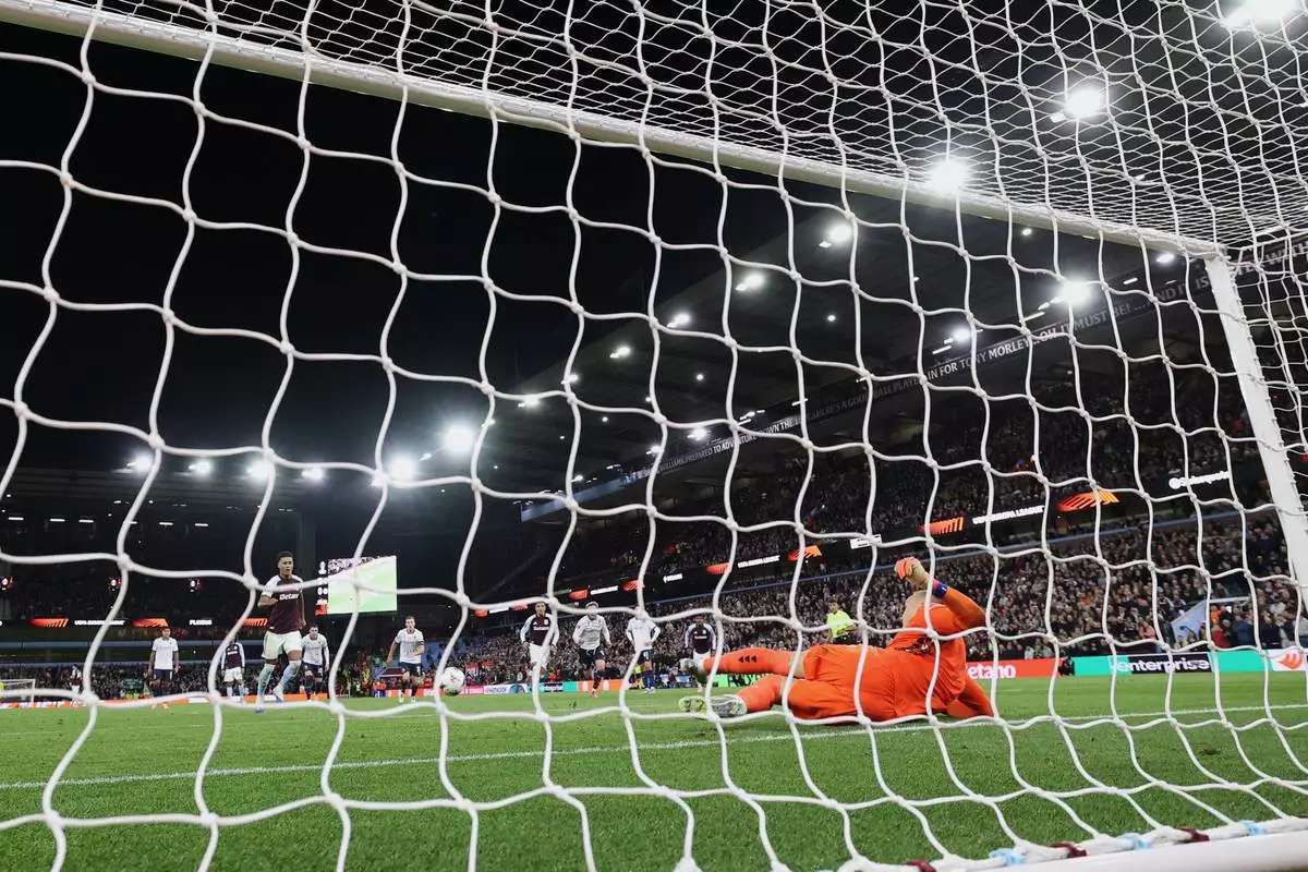 Aston Villa's Ollie Watkins, left, takes and misses a penalty during the Europa League soccer match between Aston Villa and Bologna at Villa Park stadium in Birmingham, England, Thursday, Sept. 25, 2025. (AP Photo/Darren Staples)