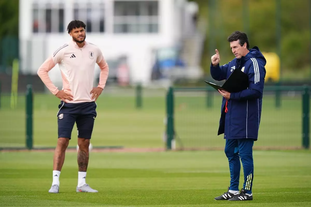 Aston Villa manager Unai Emery, right, and Tyrone Mings during a training session at Bodymoor Heath Training Ground, Tamworth, England, Wednesday Sept. 24, 2025, one day ahead of their UEFA Europa League soccer match against Bologna FC. (Jacob King/PA via AP)