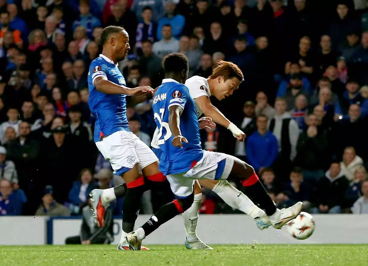 Genk's Oh Hyeon-Gyu, right, scores his sides first goal against Rangers during a Europa League soccer match at Ibrox Stadium in Glasgow, Scotland, Thursday, Sept. 25, 2025. (Ewan Bootman/PA via AP)