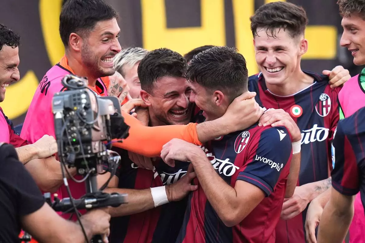 Bologna's Riccardo Orsolini, center left, celebrates scoring during the Serie A soccer match between Bologna and Genoa at the Renato Dall'Ara Stadium in Bologna, Italy, Saturday, Sept. 20, 2025. (Massimo Paolone/LaPresse via AP)