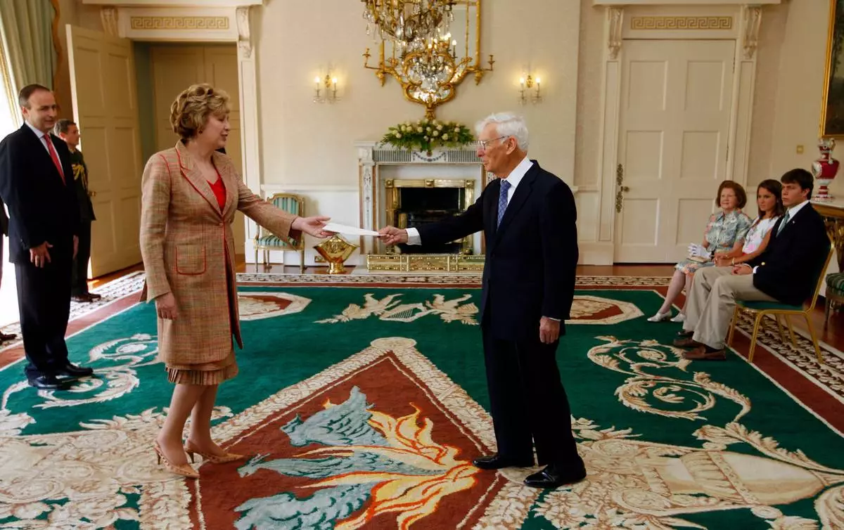 FILE - Daniel Rooney, Ambassador of the United States of America for Ireland hands his Credentials to Irish President Mary Mc Aleese at Aras an Uachtarain, Dublin, Ireland, Friday, July, 2, 2009. (AP Photo/Peter Morrison, file)