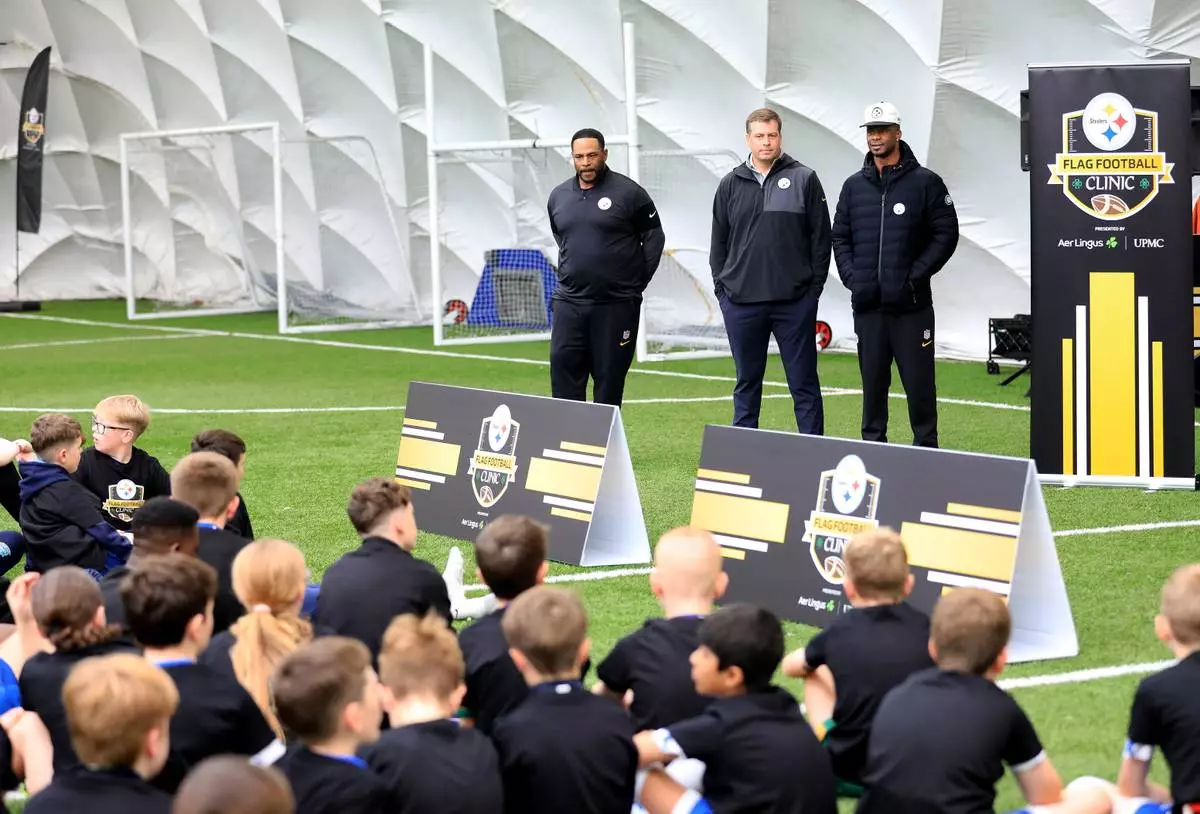 Earlier Thursday in Belfast, Steelers greats Jerome Bettis and Ike Taylor ran a flag football clinic.