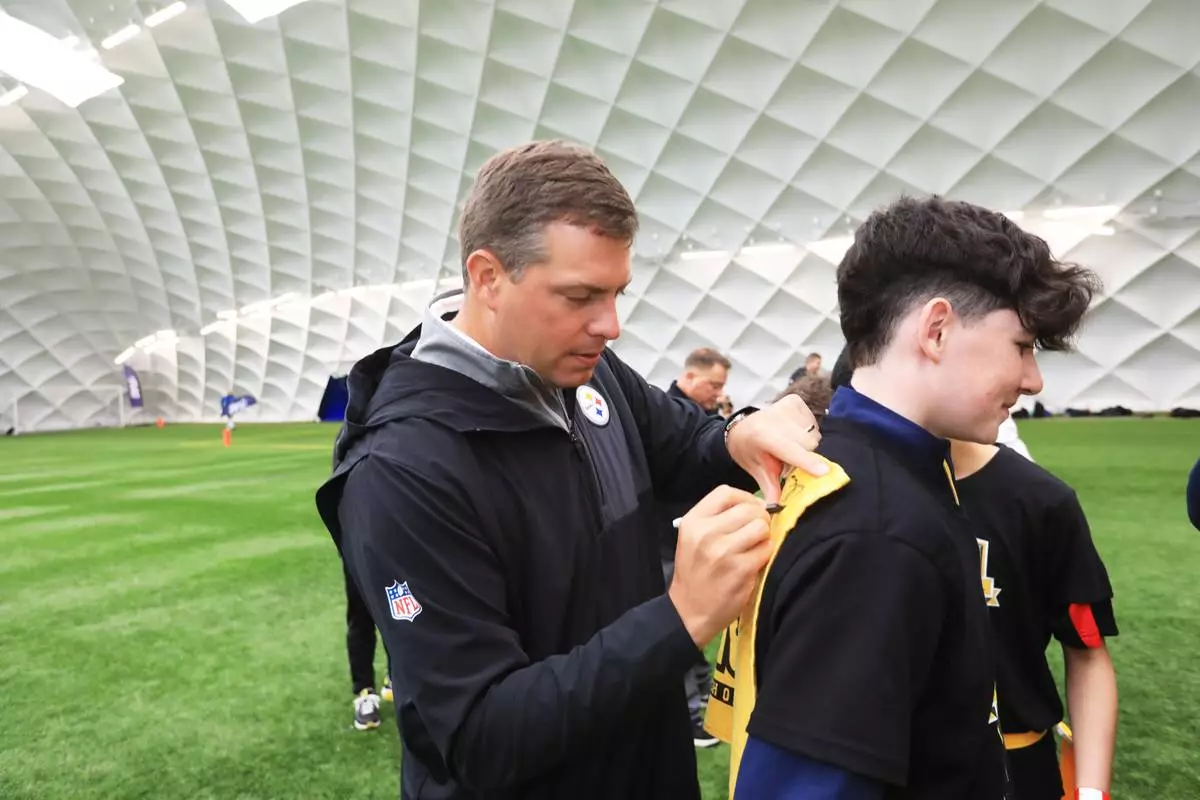 Pittsburgh Steelers' Dan Rooney signs autographs at the NFL Flag Football in Belfast, Northern Ireland, Thursday, Sept 25, 2025. (Peter Morrison/AP Content Services for the NFL)