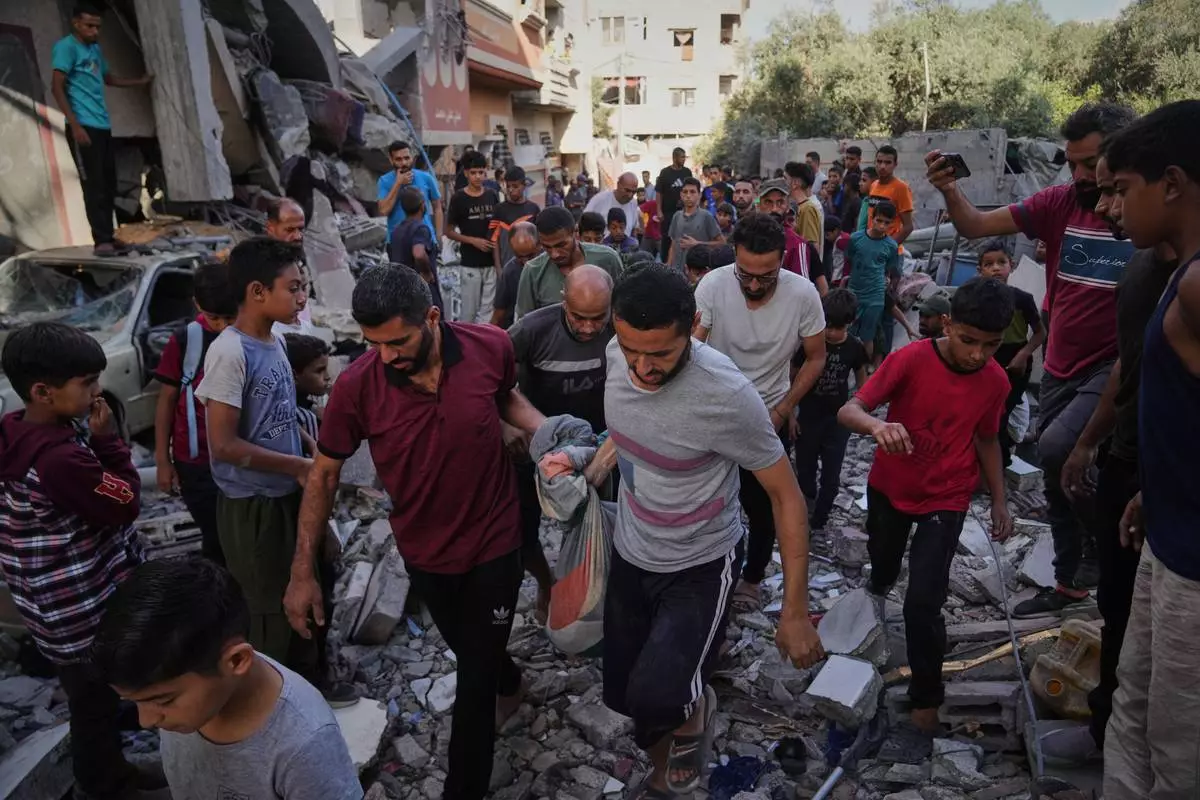 Palestinians carry the body of Hassan Nasr, 12, from the rubble of his relatives home, which was hit by an Israeli military strike in Zawaida, central Gaza Strip, Thursday, Sept. 25, 2025. (AP Photo/Abdel Kareem Hana)