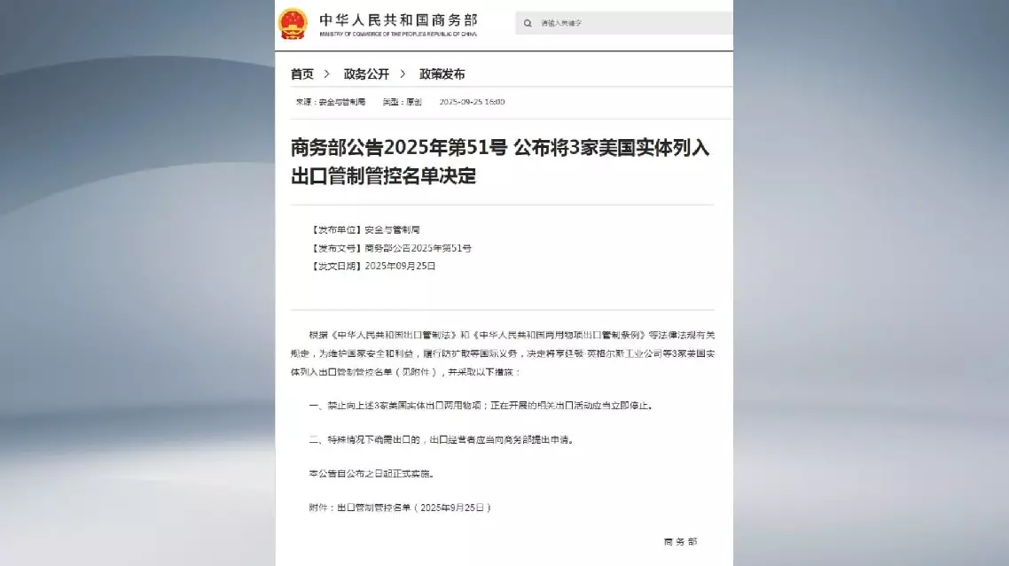 China on Thursday announced a decision to place three U.S. firms on its export control list, citing the need to safeguard national security and interests and to fulfill international obligations such as non-proliferation, according to the Ministry of Commerce.