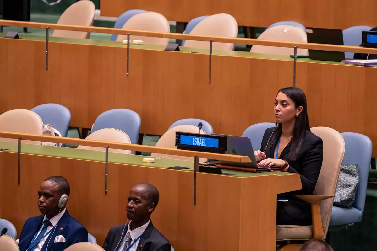 A woman from the delegation of Israel watches Palestinian President Mahmoud Abbas address the 80th session of the United Nations General Assembly via video at United Nations headquarters, Thursday, Sept. 25, 2025. (AP Photo/Angelina Katsanis)