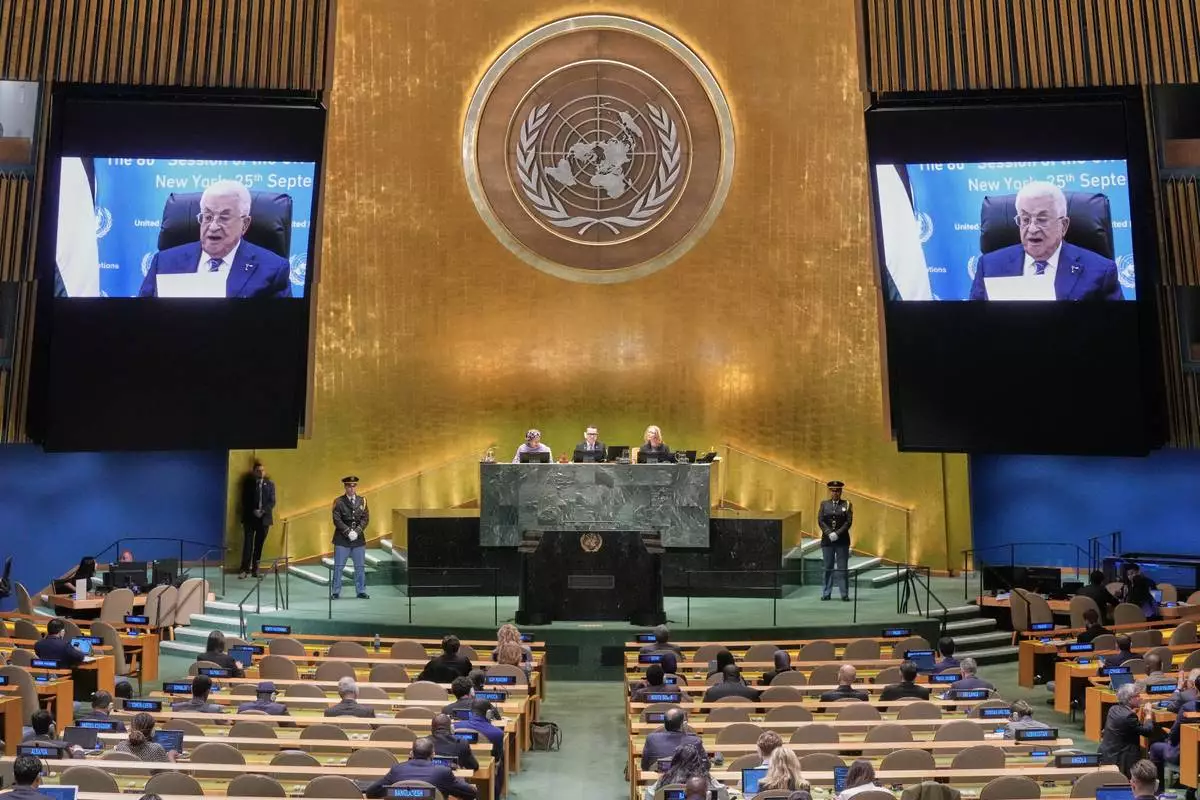 UNITED NATIONS (AP) — Speaking over video after the United States denied his visa, the Palestinian leader told world leaders Thursday that his people reject the 2023 Hamas attack on Israel and pledged that the militant group would have no role in governing the Gaza Strip after war ends and must hand over its weapons to his administration. Said Mahmoud Abbas to his people: “The dawn of freedom will emerge.”