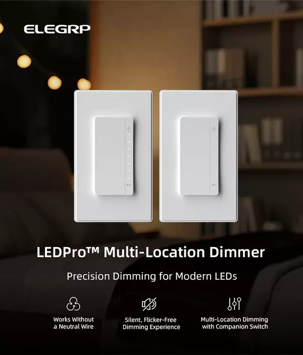 Engineered for flawless LED performance, the LEDPro™ Multi-Location Dimmer Switch ensures smooth, silent dimming across an extended range—eliminating flicker and buzz even at low brightness. Featuring ELEGRP's proprietary LEDPro™ Advanced Dimming Technology, it requires no neutral wire for easy installation in both new construction and retrofit projects. Its multi-location capability allows synchronized dimming from multiple points, making it ideal for hallways, staircases, and large spaces.