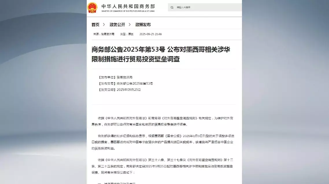China's Ministry of Commerce announced on Thursday that it has decided to initiate an investigation into Mexico's restrictive measures that constitute trade and investment barriers against China.