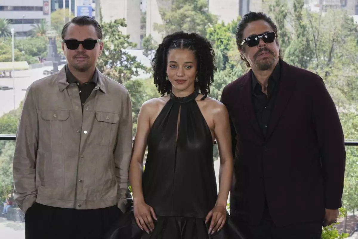 Leonardo DiCaprio, from left, Chase Infiniti and Benicio Del Toro pose during a photo call for the film 'One Battle After Another' in Mexico City, Thursday, Sept. 18, 2025. (AP Photo/Eduardo Verdugo)