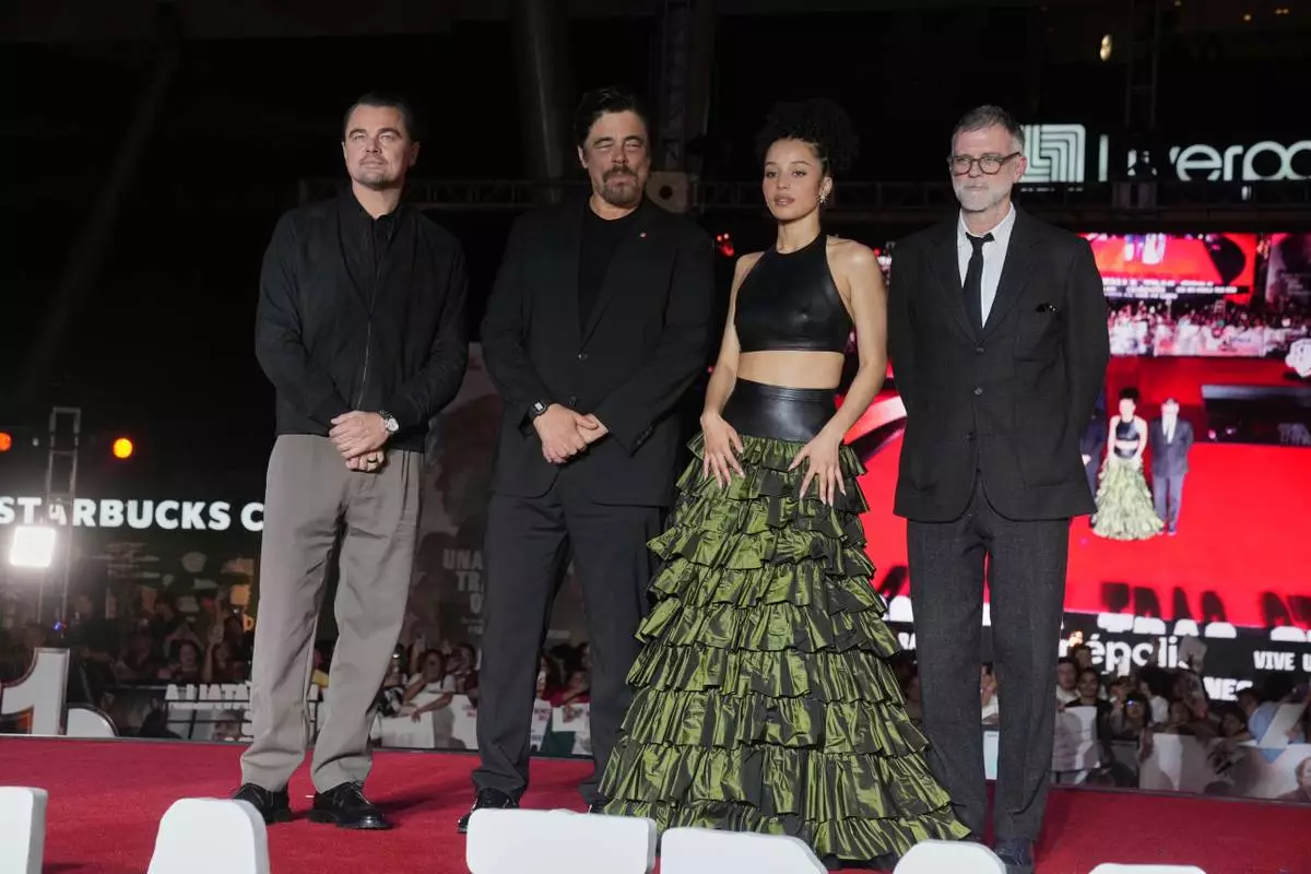From left, actors Leonardo DiCaprio, Benicio Del Toro, Chase Infiniti and Paul Thomas Anderson pose for photos during a red carpet event for the film "One Battle After Another" in Mexico City, Thursday, Sept. 18, 2025. (AP Photo/Marco Ugarte)