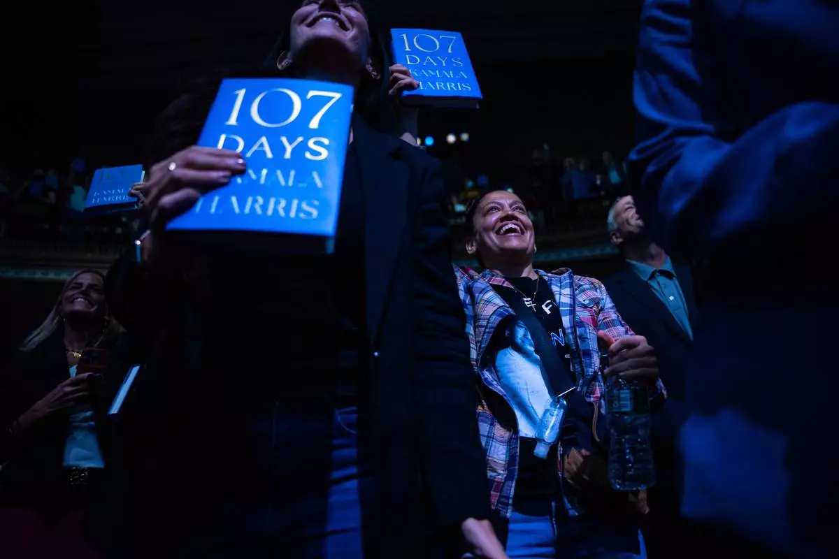 People display their copies of former Vice President Kamala Harris' new book "107 Days," about her presidential campaign on the first stop of the book's tour at Town Hall in New York, Wednesday, Sept. 24, 2025. (AP Photo/Angelina Katsanis)