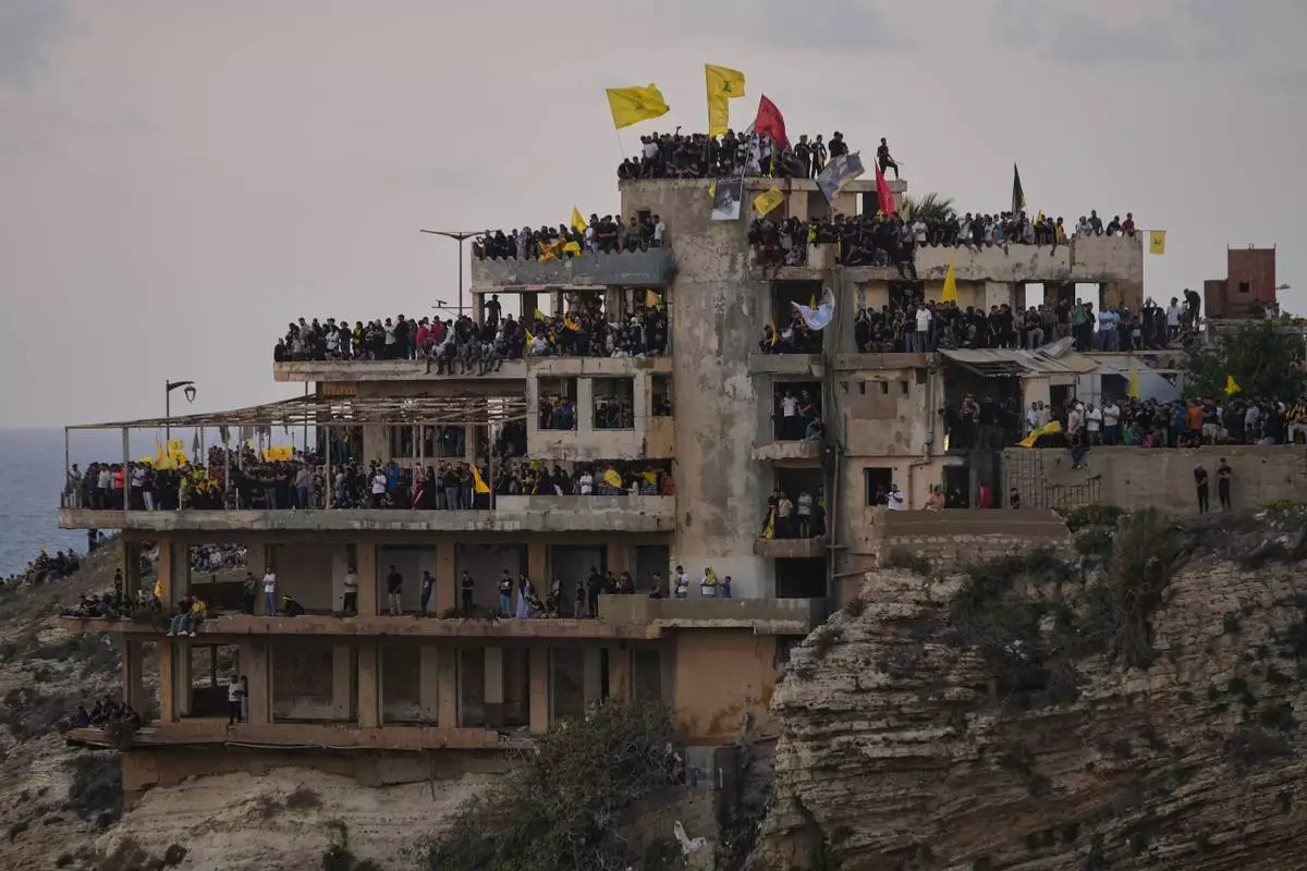 Hezbollah supporters stand on building to watch the landmark Raouche sea rock which illuminated by a portrait of late Hezbollah leader Sayyed Hassan Nasrallah during an event commemorating his anniversary assassination, in Beirut, Lebanon, Thursday, Sept. 25, 2025. (AP Photo/Hussein Malla)