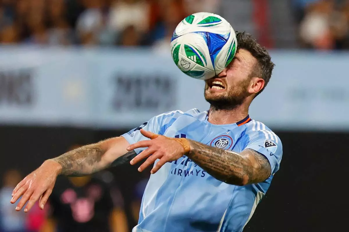 New York City FC midfielder Aiden O'Neill (21) heads the ball during the first half of a MLS soccer game against Inter Miami, Wednesday, Sept. 24, 2025, in New York. (AP Photo/Noah K. Murray)