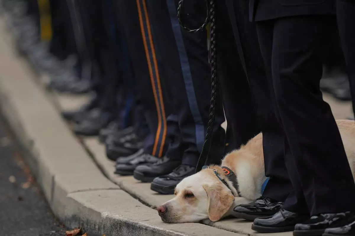 A dog accompanies officers as they wait for the conclusion of funeral services for slain Northern York County Regional Police detectives Cody Michael Becker, Mark Edward Baker and Isaiah Emenheiser, Thursday, Sept. 25, 2025, in Red Lion, Pa. (AP Photo/Matt Rourke)
