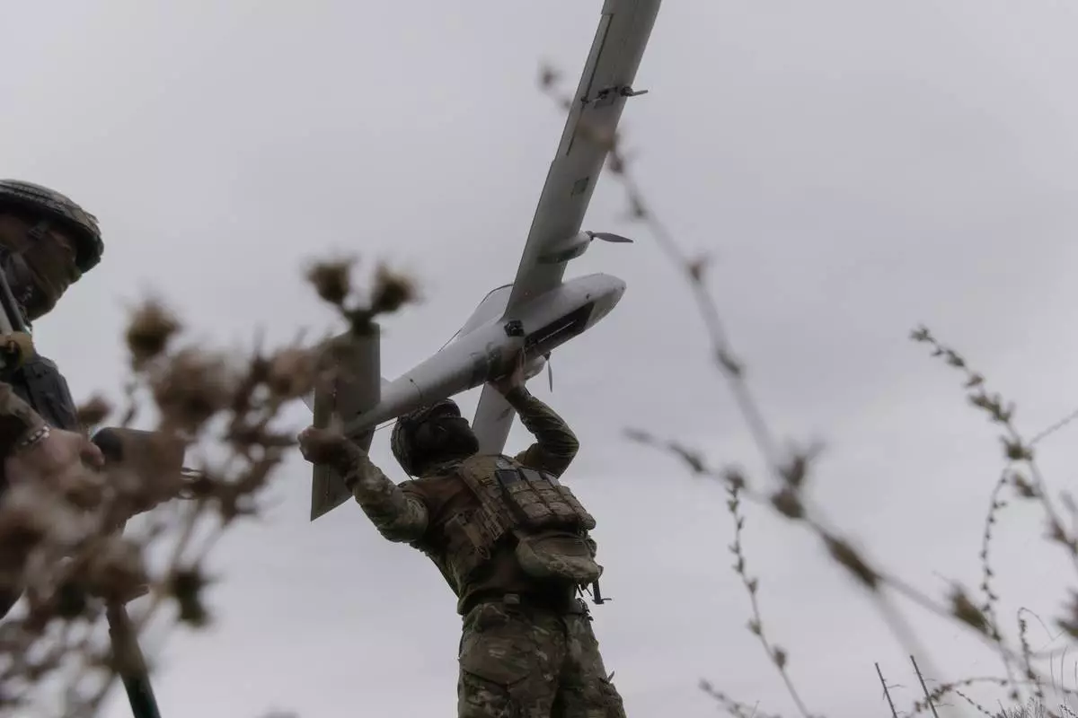 Ukrainian soldiers prepare to launch an Avenger UAV drone in Ukraine's Kharkiv region, Wednesday, Sept. 24, 2025. ( AP Photo/Yevhen Titov)