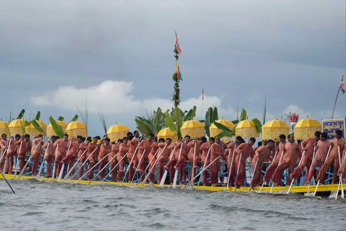 Intha ethnic people row on a long boat in a procession carrying Buddha images to a monastery during the Phaung Daw Oo pagoda festival Friday, Sept. 26, 2025, in Inle Lake, southern Shan State, Myanmar. (AP Photo/Thein Zaw)