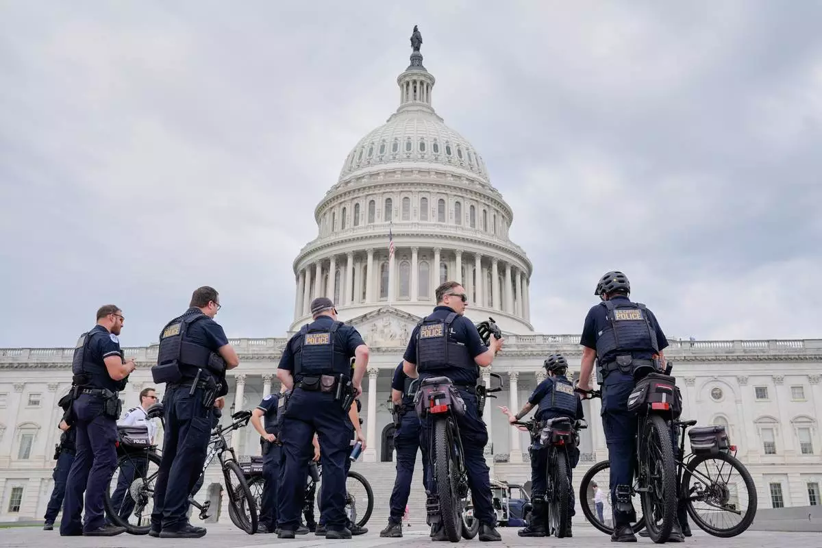 The U.S. Capitol police officers patrol outside of Capitol building, Wednesday, Sept. 24, 2025, in Washington. (AP Photo/Mariam Zuhaib)