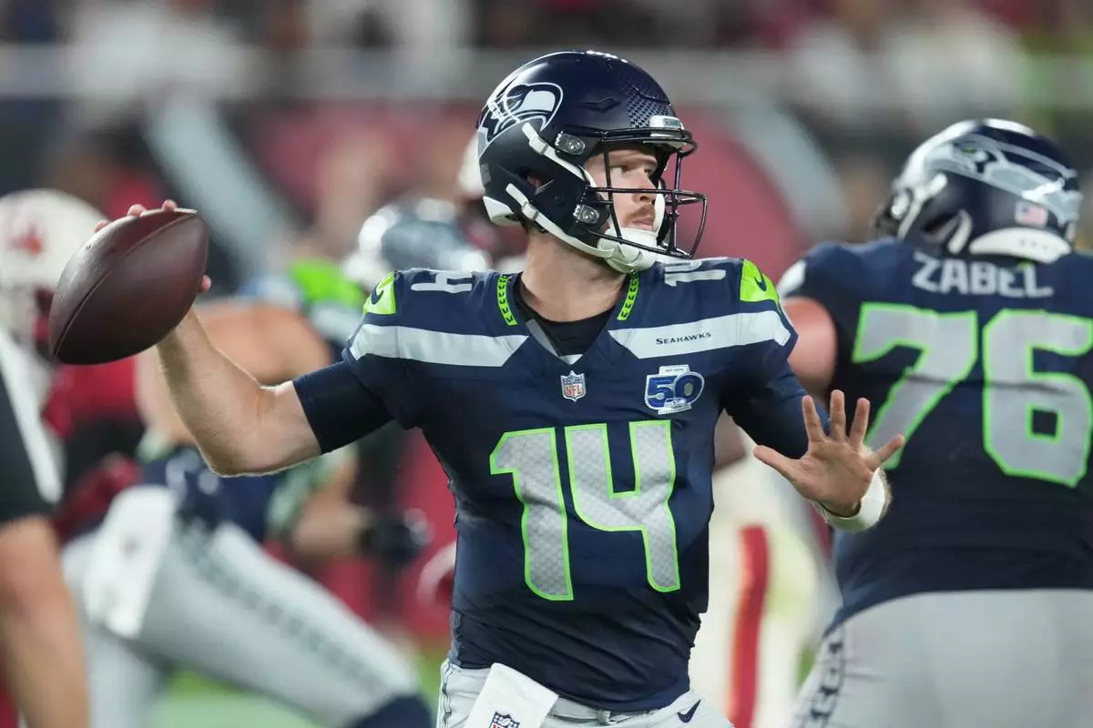 Seattle Seahawks quarterback Sam Darnold (14) throws during the second half of an NFL football game against the Arizona Cardinals Thursday, Sept. 25, 2025, in Glendale, Ariz. (AP Photo/Ross D. Franklin)