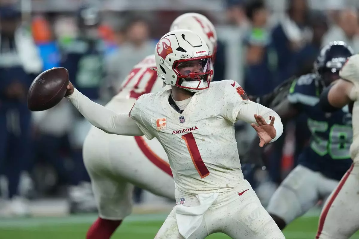 Arizona Cardinals quarterback Kyler Murray (1) throws during the first half of an NFL football game against the Seattle Seahawks Thursday, Sept. 25, 2025, in Glendale, Ariz. (AP Photo/Ross D. Franklin)