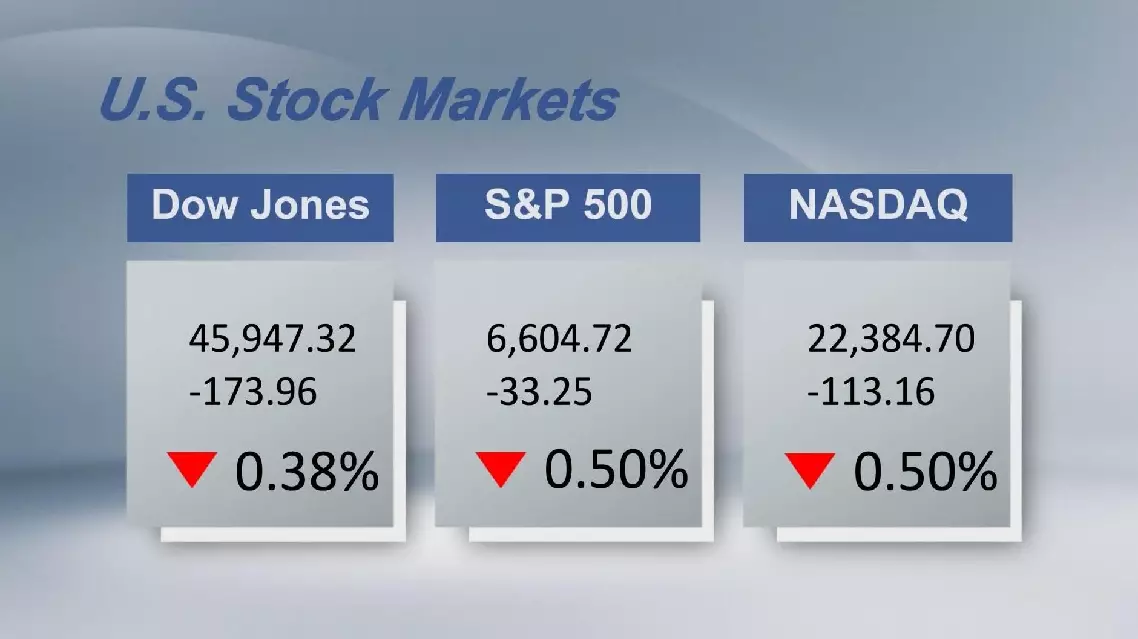 The Dow Jones Industrial Average dropped 173.96 points, or 0.38 percent, to 45,947.32. The Standard and Poor's 500 lost 33.25 points, or 0.5 percent, to 6,604.72. The Nasdaq Composite Index declined 113.16 points, or 0.5 percent, to 22,384.7.