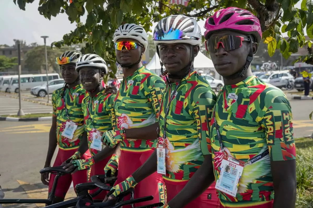 Mali team members get ready for Time Trial practice for the upcoming UCI road cycling world championships In Kigali, Rwanda, Saturday, Sept. 20, 2025.(AP Photo/Jerome Delay)