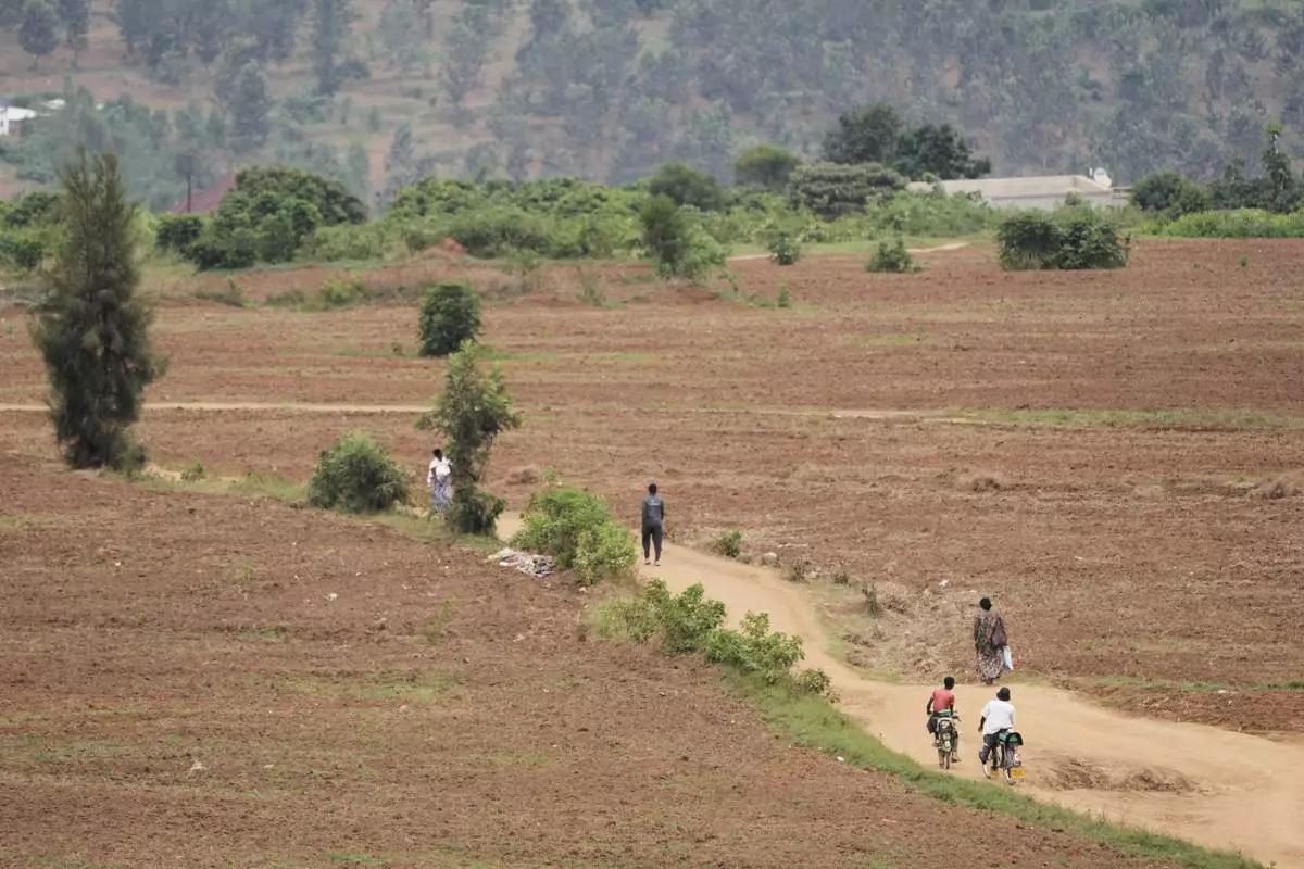 People walk and cycle along a dirt road during the men's Under 23 individual time trial event, at the road cycling World Championships in Kigali, Rwanda, Monday, Sept. 22, 2025. (AP Photo/Jerome Delay)