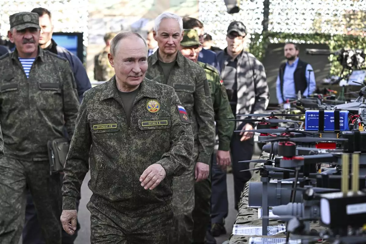 CORRECTS SOURCE FOR POOL - Russian President Vladimir Putin accompanied by Deputy Defence Minister Yunus-Bek Yevkurov, left, and Defence Minister Andrei Belousov, right, inspects Russian weapons and equipment during his visit to the Russian-Belarusian joint military drills "Zapad 2025" (West 2025) at the Mulino training ground in Nizhny Novgorod region, Russia, Tuesday, Sept. 16, 2025. (Sergey Bobylev/Sputnik, Kremlin Pool Photo via AP)