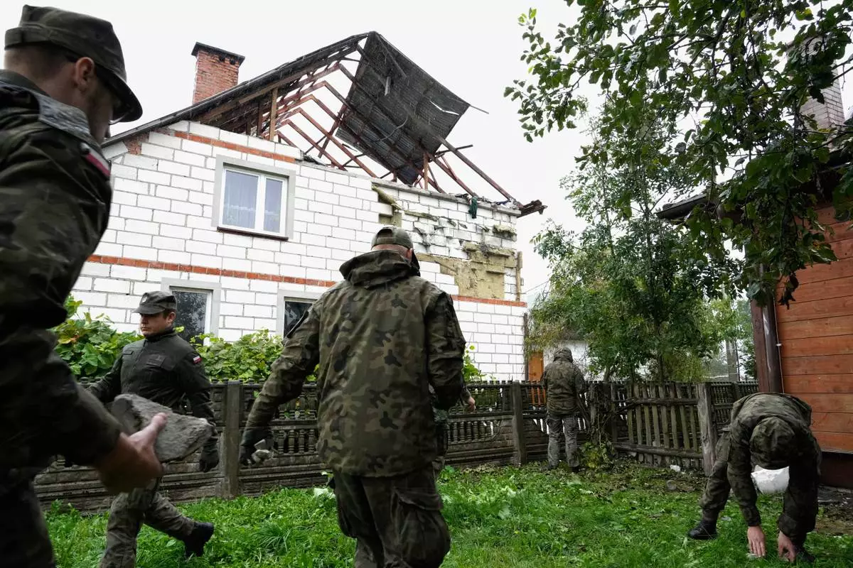 Territorial defense officers pick up debris from the destroyed roof of a house, in Wyryki, Poland, Thursday, Sept. 11, 2025, after Russian drones violated Polish airspace. (AP Photo/Czarek Sokolowski)