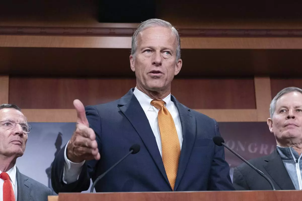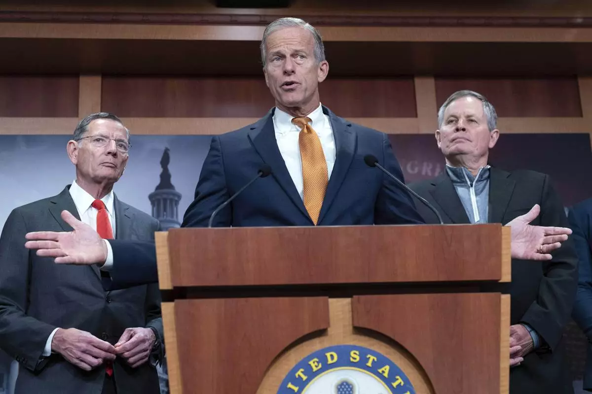Senate Majority Leader John Thune, R-S.D., flanked by Sen. John Barrasso, R-Wyo., left, and Sen. Steve Daines, R-Mont., speaks during a news conference on Capitol Hill in Washington, Friday, Sept. 19, 2025. (AP Photo/Jose Luis Magana)
