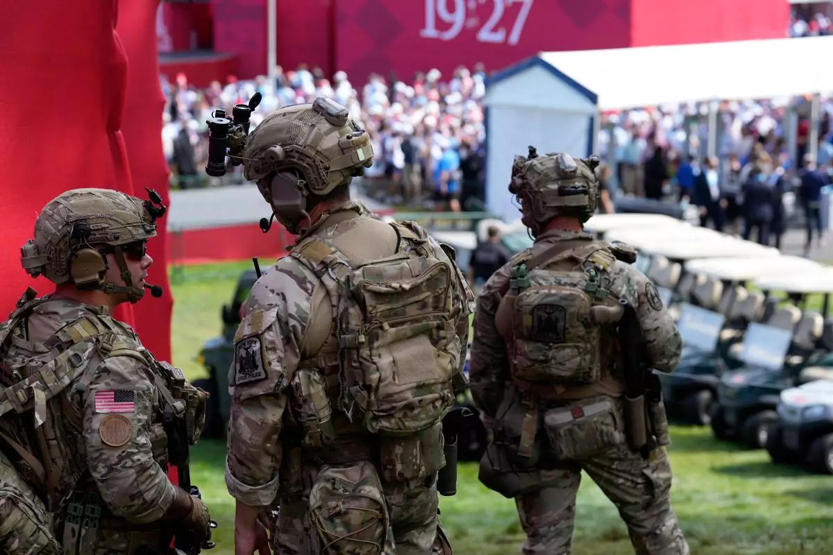 Security personnel watch at Bethpage Black golf course during the Ryder Cup golf tournament, Friday, Sept. 26, 2025, in Farmingdale, N.Y. (AP Photo/Seth Wenig)