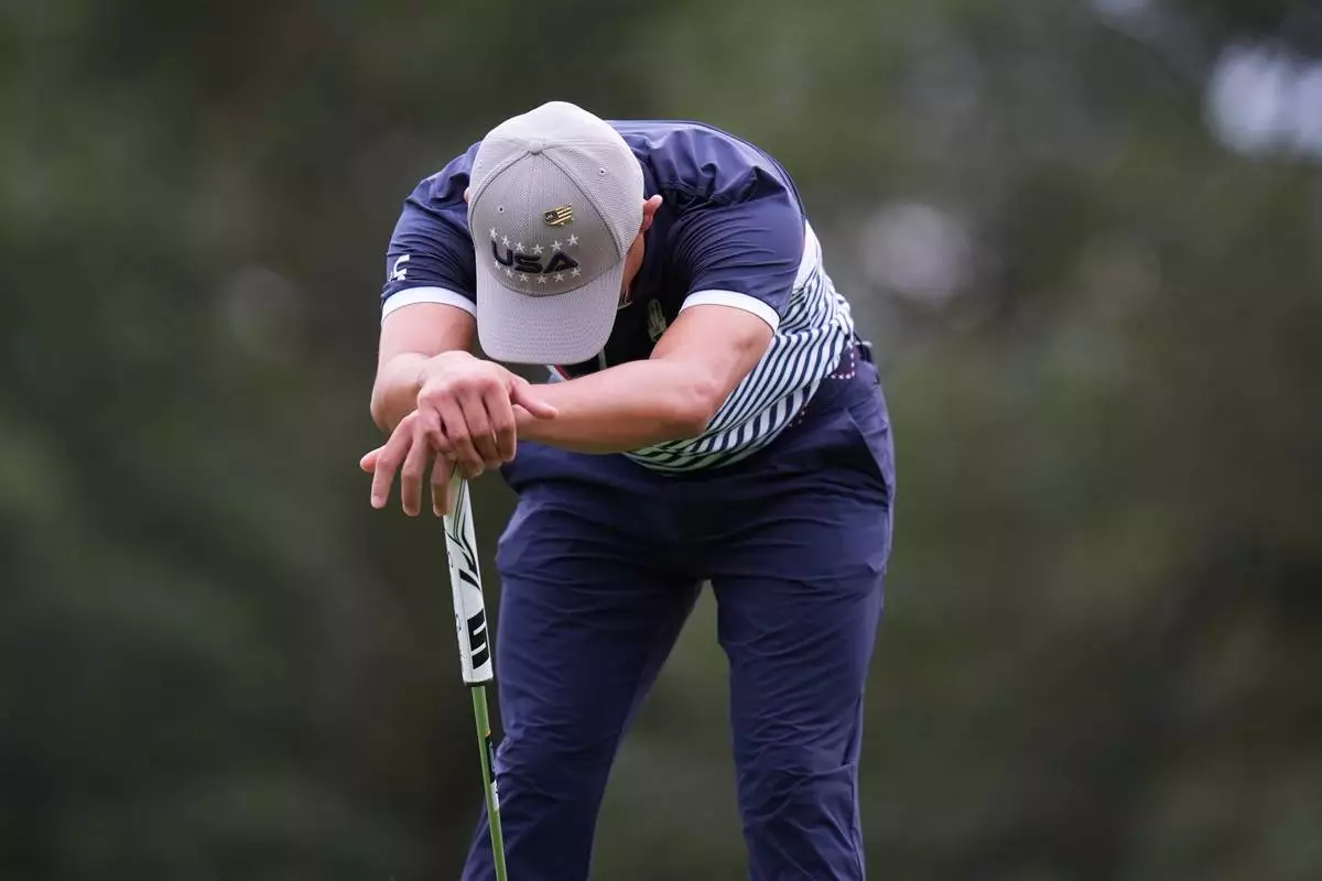 United States' Collin Morikawa reacts after missing a putt on the third hole at Bethpage Black golf course during the Ryder Cup golf tournament, Friday, Sept. 26, 2025, in Farmingdale, N.Y. (AP Photo/Seth Wenig)