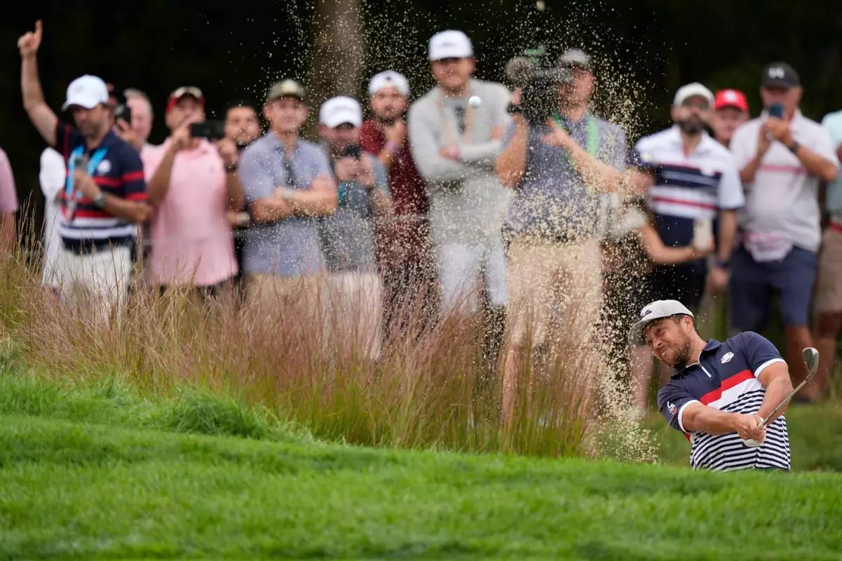United States' Xander Schauffele hits from the bunker on the seventh hole at Bethpage Black golf course during the Ryder Cup golf tournament, Friday, Sept. 26, 2025, in Farmingdale, N.Y. (AP Photo/Robert Bukaty)