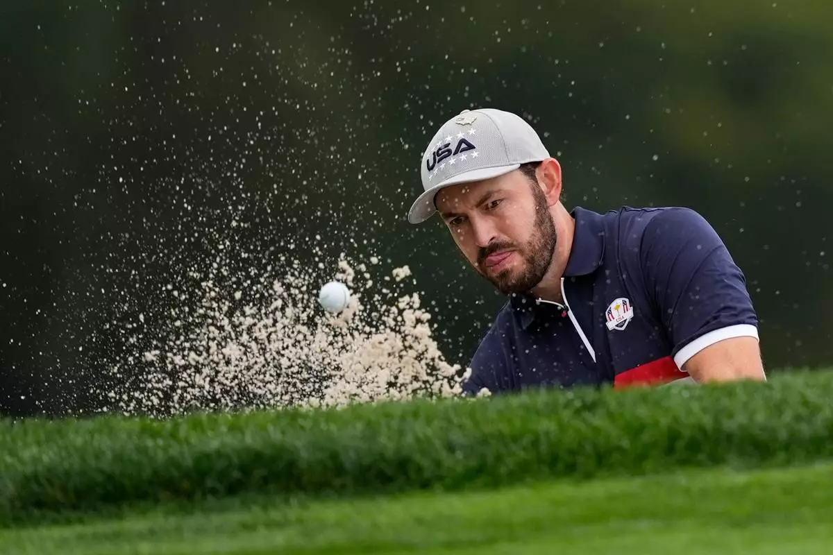 United States' Patrick Cantlay hits from the bunker on the fourth hole at Bethpage Black golf course during the Ryder Cup golf tournament, Friday, Sept. 26, 2025, in Farmingdale, N.Y. (AP Photo/Robert Bukaty)