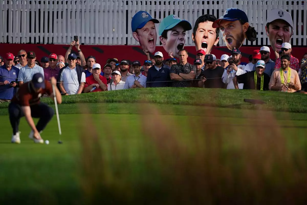 Fans hold up photos as Europe's Matthew Fitzpatrick lines up a putt on the seventh hole at Bethpage Black golf course during the Ryder Cup golf tournament, Saturday, Sept. 27, 2025, in Farmingdale, N.Y. (AP Photo/Matt Slocum)